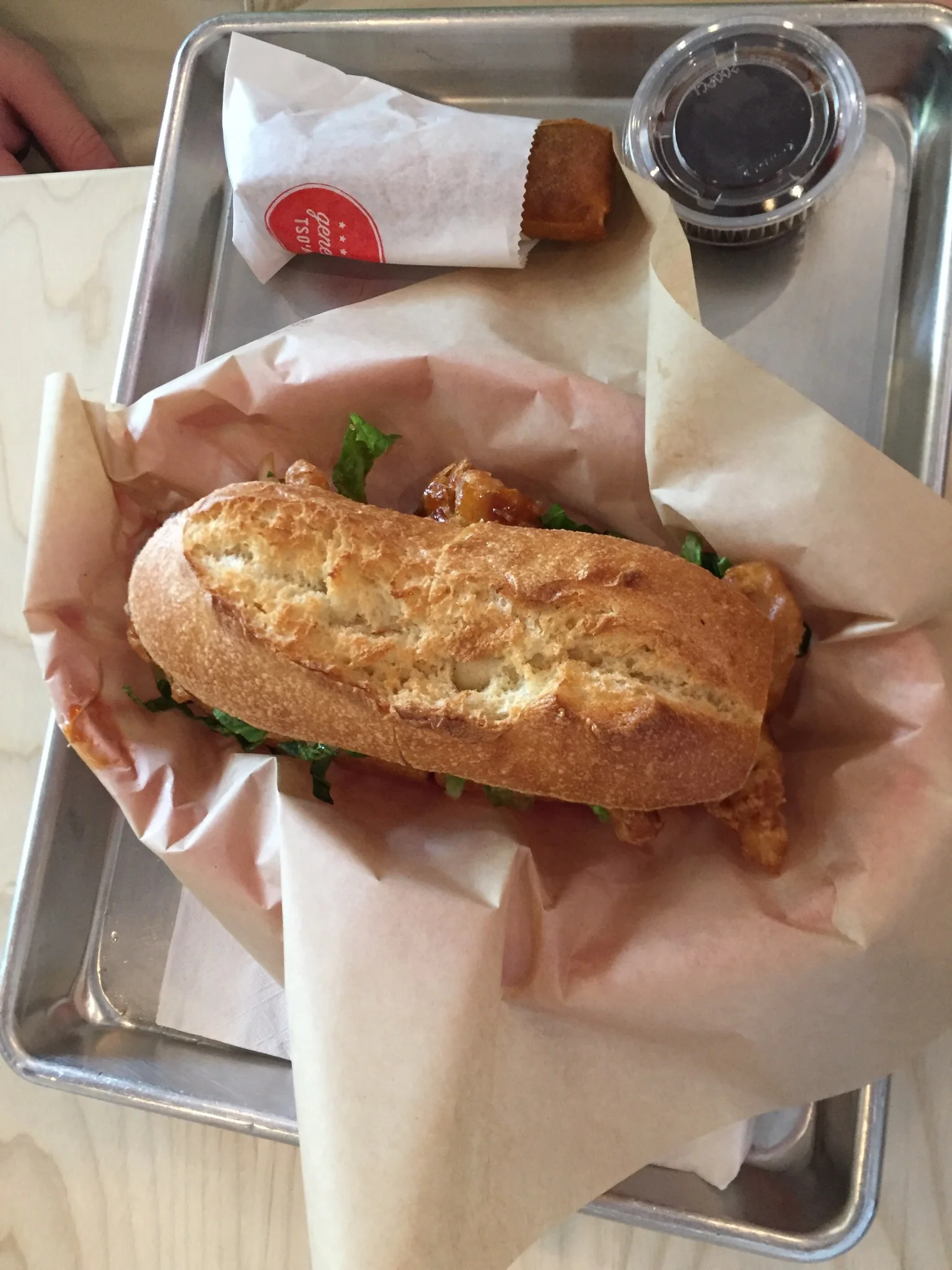 Last week, Mike left his laptop cord at work, which led to an adventure for us. We needed to go to the Apple Store at the Domain after we ran another errand. We got the cord quickly and then had some time for lunch. We headed over to the Rock Rose to check out our lunch options. There were a few places we'd tried before, a few we didn't feel like, and several new places. Eventually, we decided to try General Tso' Boy. It was an Asian inspired sandwich shop.