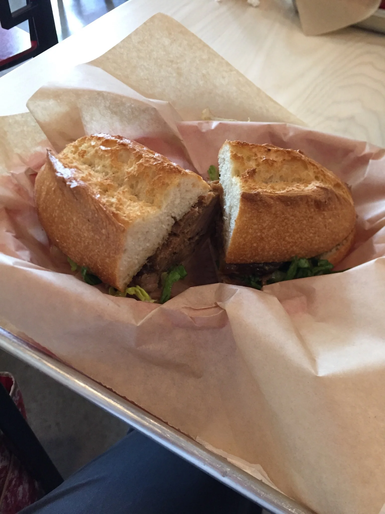 We got there at just the right time, as the place was hopping. It was ok that we had a little wait so we had time to select our items. Mike went with the General Tso' Chicken sandwich and a hamburger spring roll. I opted for the Char Siu Pulled Pork sandwich. The spring roll really tasted like a hamburger. It was pretty good, especially when combined with the honey sriracha ketchup. Mike's sandwich wasn't bad either, it was general tso's style chicken on a sub sandwich. The bread was fresh baked from Easy Tiger, a local bakery and bar. My sandwich was delicious. It was an Asian BBQ style pulled pork sandwich. It had great flavor and was very filling. Overall, we really liked our food and will be back again.